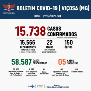 A Vigilância Epidemiológica divulga o 627º Boletim Epidemiológico de Covid-19, nesta quarta-feira, 27, referente às últimas 24 horas. Foram realizados oito testes de detecção do Coronavírus, sendo um resultado positivo