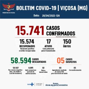 A Vigilância Epidemiológica divulgou o 628º Boletim Epidemiológico de Covid-19, nesta quinta-feira, 28, referente às últimas 24 horas. Foram realizados 10 testes de detecção do Coronavírus, sendo três resultados positivos