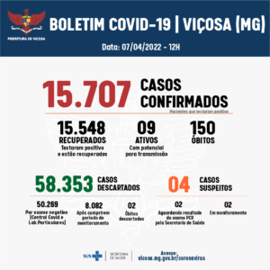 Viçosa: uma pessoas testou positivo para a Covid-19 nas últimas 24 horas