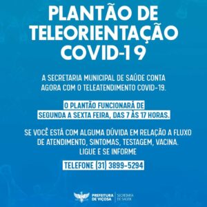 A Secretaria Municipal de Saúde, da Prefeitura de Viçosa, conta agora com Teleatendimento Covid-19, para orientações a respeito da doença. O plantão vai funcionar de segunda a sexta-feira, das 7