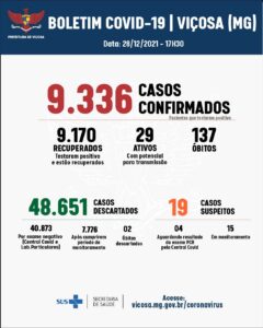 A Vigilância Epidemiológica de Viçosa confirmou nove casos de Covid-19, no boletim de ontem, terça-feira, 28. O município contabiliza agora 9.336 confirmações, sendo que 9.170 pessoas já estão recuperadas da