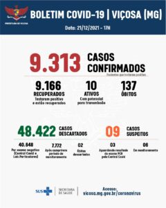 A Vigilância Epidemiológica não registrou nenhum caso de Covid-19, nesta quarta-feira, 22. Viçosa contabiliza 9.313 confirmações, sendo que 9.166 pessoas já estão recuperadas da doença. São 10 casos ativos e