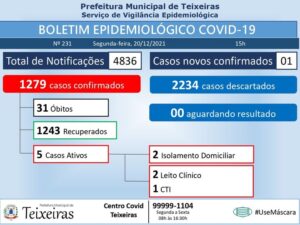 A cidade de Teixeiras manteve a estabilidade de novos casos e registrou um novo caso de coronavírus nesta segunda-feira (20). A informação foi divulgada pela prefeitura municipal no boletim epidemiológico