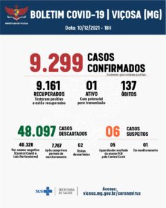 Pelo quarto dia consecutivo, a Vigilância Epidemiológica não registrou nenhum caso de Covid-19. Nesta quinta-feira, 09, Viçosa contabiliza 9.298 casos, sendo que 9.159 pessoas já estão recuperadas da doença. São