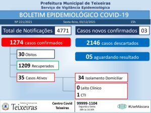 Teixeiras divulgou na tarde desta sexta-feira, 03, o boletim epidemiológico com três novos casos de coronavírus. Com os novos casos Teixeiras tem agora 1274 casos confirmados, 1209 recuperados e 30