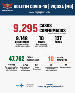 A Vigilância Epidemiológica não registrou nenhum caso de Covid-19, nesta quinta-feira, 02. Viçosa contabiliza 9.295 confirmações, sendo que 9.148 pessoas já estão recuperadas da doença. São 10 casos ativos e