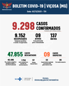 A Vigilância Epidemiológica confirmou três casos de Covid-19, nesta sexta-feira, 03. Agora, Viçosa contabiliza 9.298 confirmações, sendo que 9.152 pessoas já estão recuperadas da doença. São nove casos ativos e