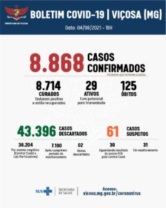 A Vigilância Epidemiológica confirmou mais quatro óbitos e cinco novas confirmações de Covid-19, nesta quarta-feira, 04. Agora, Viçosa contabiliza 8.868 confirmações, sendo que 8.714 pessoas já se recuperaram da doença.