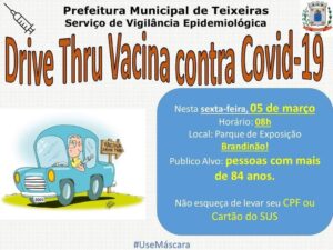 Nesta sexta-feira (05) a partir das 8h, a Secretaria Municipal de Saúde realizará um Drive Thru, no parque de exposições Brandinão, para vacinar os idosos com mais de 84 anos,