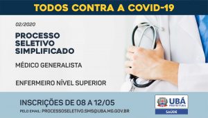 A Prefeitura de Ubá, através da Secretaria de Saúde, divulgou o Edital 02/2020 de Processo Seletivo Simplificado para contratação temporária de médicos generalistas e enfermeiros (nível superior), exclusivamente, para atuação