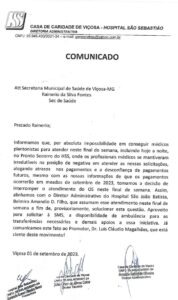 Em comunicado direcionado ao Secretário de Saúde Rainerio Fontes, o Hospital São Sebastião anuncia que não realizará pronto atendimento nesse final de semana, começando pela noite dessa sexta-feira (01). A