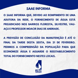 Manutenção na ETA II pode causar intermitência no fornecimento de água em Viçosa; SAAE pede economia. O Serviço Autônomo de Água e Esgoto (SAAE) de Viçosa informa que, devido à