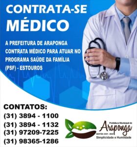 A Prefeitura de Araponga está com vagas abertas para a contratação de um médico para atuar programa Saúde da Família no PSF – Estouros. Para mais informações, a Prefeitura de