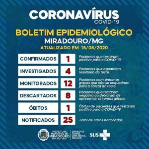 A Prefeitura Municipal de Miradouro comunica que uma paciente internada com diagnóstico de COVID-19, veio a óbito. A vítima é uma senhora de 84 anos, com comorbidades. Com isso, o