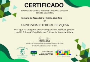 O Programa Lixo Zero da UFV, realizado durante as edições da Semana do Fazendeiro desde 2018, recebeu o Prêmio A3P de Melhores Práticas de Sustentabilidade na Administração Pública, na categoria Gestão