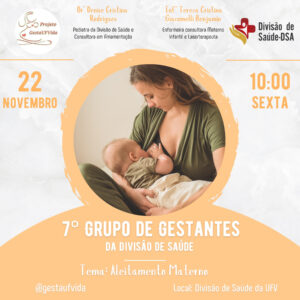 Nesta sexta-feira (10), às 10h, a Divisão de Saúde (DSA), em parceria com o projeto de extensão GestaUFVida, promoverá o 7º Encontro do Grupo de Gestantes, com o tema Aleitamento Materno.