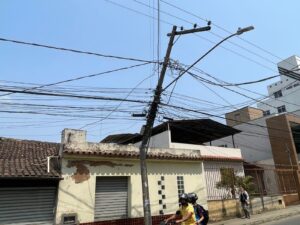 Caminhão baú bate em poste de luz e fica pendurado por cabo de energia, na Rua da Conceição Na manhã desta sexta-feira (20), por volta das 11:30h da manhã, um