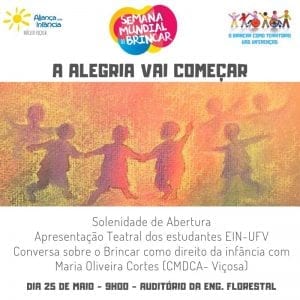 Acontece entre os dias 25 e 31 de maio, a Semana Mundial do Brincar em Viçosa, voltada para as turmas de educação infantil e ensino fundamental I. Segundo a secretária