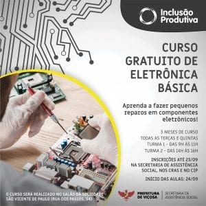 O setor de Inclusão Produtiva da Secretaria Municipal de Assistência – SMAS, oferecerá um curso gratuito de Eletrônica Básica. As aulas começam no dia 24 de setembro e haverá duas turmas,