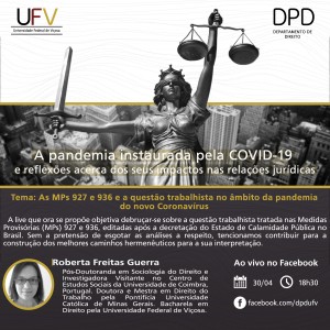 Nesta quinta-feira (30), às 18h30, o Departamento de Direito (DPD) transmitirá uma live com a temática As Medidas Provisórias (MPs) 927 e 936 e a questão trabalhista no âmbito da