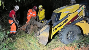 Bezerro cai em buraco de 5m e bombeiros fazem resgate com retroescavadeira