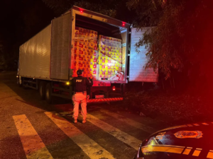 Mercadorias estavam sem documentação fiscal e foram apreendidas pela Polícia Rodoviária Federal (PRF) na BR-040, em Simão Pereira. Mais de 100 mil latas de cerveja e 540 caixas de sabão
