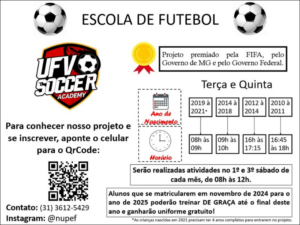 O projeto UFV Soccer Academy, vinculado ao Núcleo de Pesquisas e Estudos em Futebol (Nupef), está com inscrições abertas para crianças de Viçosa e região nascidas entre 2010 e 2021.