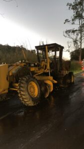 Uma máquina patrol (comumente utilizada em obras de construção civil para nivelar terrenos e realizar terraplenagem) pertencente à Prefeitura de Teixeiras pegou fogo na tarde desta segunda-feira (30), por volta das 16h40, na rodovia MGC-120.