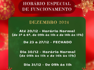 A equipe do Museu Casa Arthur Bernardes (CAB) informa que o local terá horários especiais para visitação entre os dias 23 e 31 de dezembro: – Até 20/12: