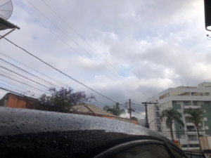 Nesta quinta-feira, o efeito dos ventos marítimos associado a um sistema de Alta Pressão Atmosférico que se encontra no oceano Atlântico Sul deixa o céu com muitas nuvens e chuva
